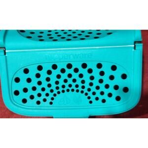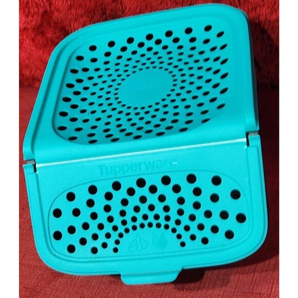 The Tupperware Garlic Shallot Onion Keeper with Lid Holder is a small rectangular storage container set designed to keep garlic, shallots, and onions fresh for longer periods of time. The snap-on lid helps to seal in the freshness and the compact size makes it easy to store in your kitchen drawer or cabinet. This original Tupperware product in black and teal color features one compartment and comes with a lid as part of the set. Perfect for organizing your kitchen storage needs, this onion keeper is a practical and stylish addition to your home.