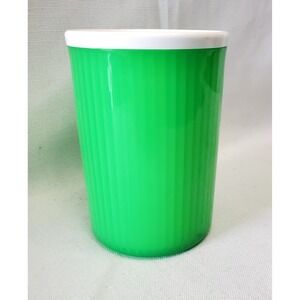 The Tupperware Insulated Mug Handled Cup Tumbler in green is a vintage collectible kitchen item that adds a touch of retro charm to your kitchen storage and organization. With a large 16 oz capacity and made of durable acrylic material, this round-shaped tumbler features a classic white and green color scheme that is both stylish and practical. The mug is reusable and comes from the original Tupperware brand, making it a lasting addition to your kitchen storage collection.