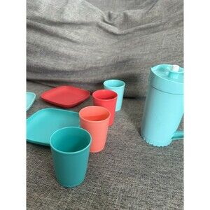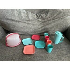 Tupperware Kids 13 Piece Party Set Mini Tumblers Pitcher Plates Cake Carrier