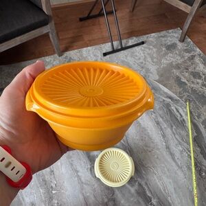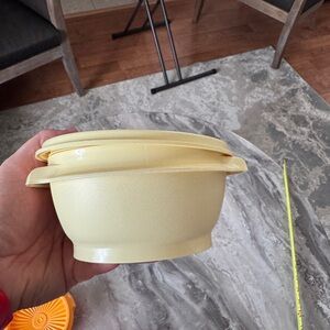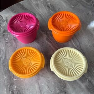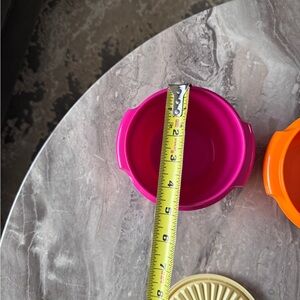 Brighten your kitchen with this vibrant set of storage bowls. Includes pink, orange, and cream bowls with matching lids. Perfect for organizing and storing food.