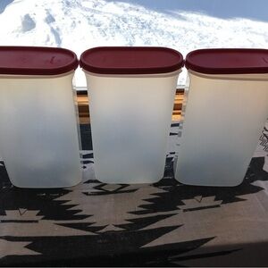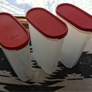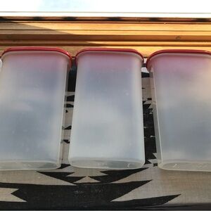 Organize your kitchen with these stylish Tupperware red and clear storage containers. Perfect for keeping your pantry neat and tidy. Set of 3, 11” by 6”, by 3”, tight lids, like new