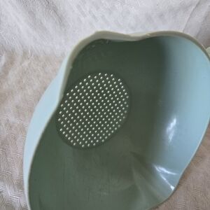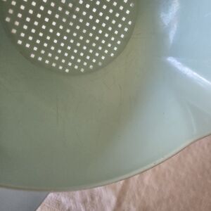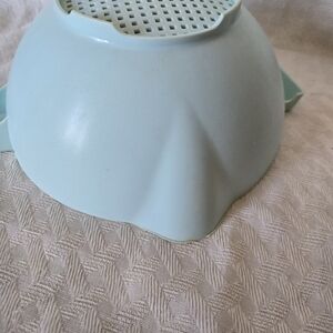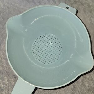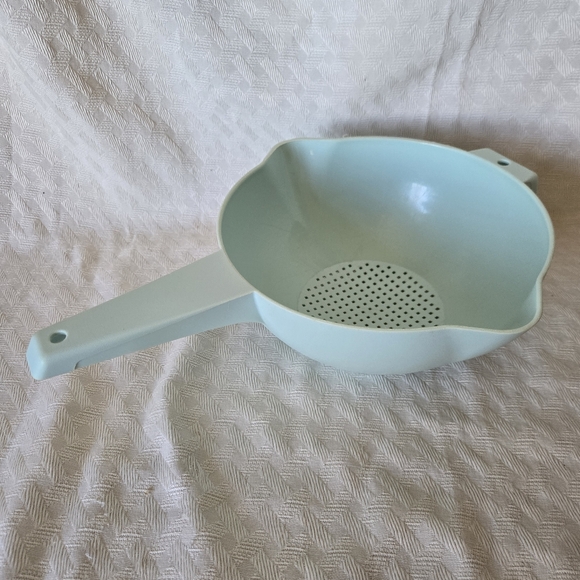 Blue Tupperware vintage strainer. There is wear along the edge and scratches on the inside as shown in pictures. But doesn't hinder the use.