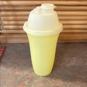 Vibrant lemon yellow Tupperware containers. Includes multiple sizes with secure lids. Includes 1 quart pitcher and 2 quart pitcher. 2 quart pitcher has Carry handle and pour lid. Two refrigerator bowls with lids. And one mixer container with mixer disc and pour lid. Gently used. Tupperware has lifetime warranty against cracking, peeling chipping, or breaking.