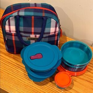 Stylish plaid lunch bag with matching containers. Perfect for meals on the go. Never used.