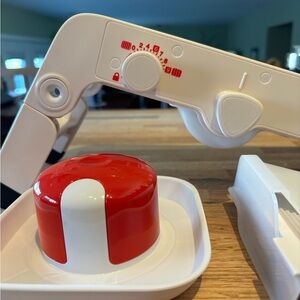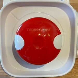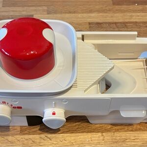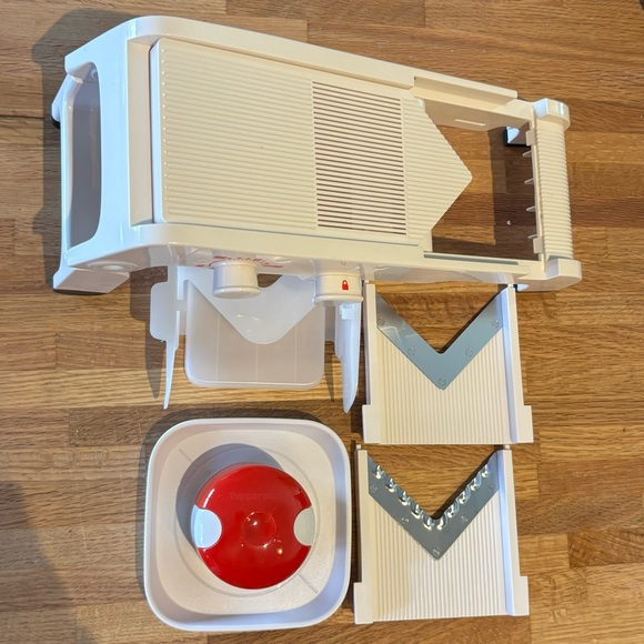 Lightly used, extremely sharp. This highly durable, Tupperware brand mandolin is a time saver for cutting all your veggie needs. Folds up to fit more compactly in your cabinet.