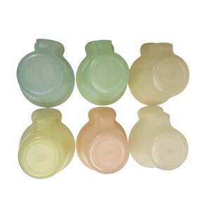 Tupperware Millionaire Line Pastel Stacking Cups Dinner & Dessert Plates Lot. Service for plus a bonus small plate. In light pastel colors. In vintage preowned condition: bubbling to the plastic on small plates, scratching on the larger plates and overall wear. They have been hand washed but they do have a musty smell.