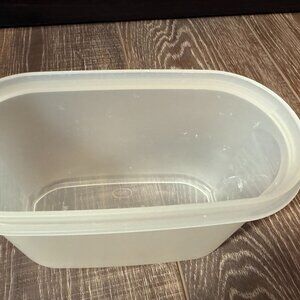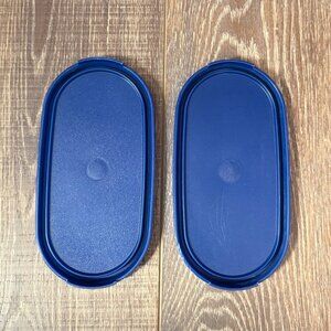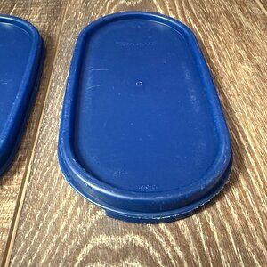 Tupperware Modular Mate Storage Containers. Set of 2. Sheer containers with dark blue lids. Both containers measure 4 ½” x 7” x 3 ½”. There are a 4 ¾ cup capacity. Bottom pieces are numbers 1612-23 and 1612-2. Lids are numbers 1616-20 and 1616-21. Bottom pieces have a couple white marks and the lids have some wear marks but are in overall good used condition. No major flaws, clean, odor free, and seal completely. Please see photos.