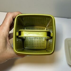 This Tupperware Pickle Keeper set is a vintage collector's item that comes in a beautiful avocado green color. The set includes a container, lid, and strainer, all made of high-quality plastic material. The olive wood tone adds a touch of elegance to the rectangular-shaped containers.