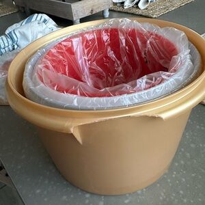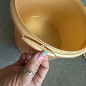 Various sizes and colors, new with plastic wrap. Noticed a small chip on large canister rim but does not affect lid closing with air tight seal. See photo.