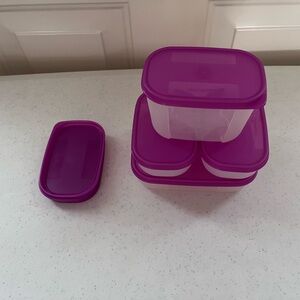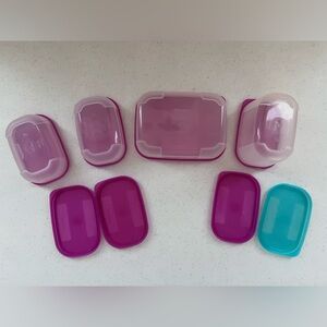 Vintage Tupperware container set. Four small containers with purple lids. I will include the blue one listed also. See photos for condition. Comes with all shown including extra lids.
