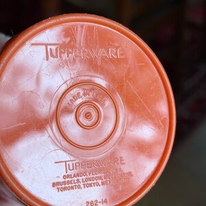 Tall orange Tupperware cup. Decent vintage condition. Second pic shows some wear/marks of some sort on the hinged cap.