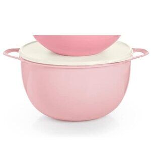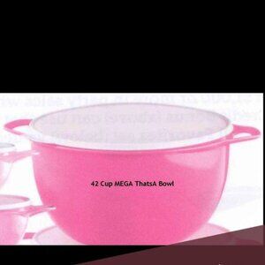 Add a pop of color to your kitchen with this Tupperware Thatsa Bowl in pastel pink! This mega bowl has a capacity of 42 cups and comes with a seal to keep your food fresh. Made of durable plastic, this bowl is perfect for mixing, storing, or serving your favorite dishes. Whether you're preparing a meal for a big family gathering or just need a reliable container for your leftovers, this Tupperware bowl is a must-have for any kitchen.