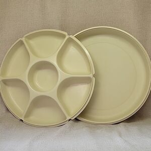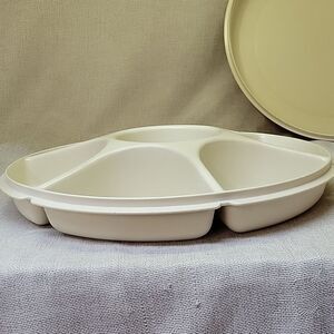 This Tupperware Divided Serving Tray is perfect for serving fruits and vegetables with dips. The tray measures 14 inches in length and width, with a height of 3 inches. It features 7 slots and comes with a lid to keep your food fresh. The tray is almond in color. It is made of high-quality materials and is durable for everyday use. This set includes a tray and a lid, and is a great addition to your kitchen storage and organization collection.