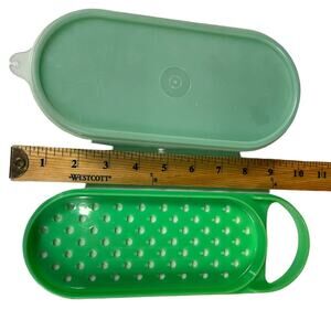 1970'sVintage grater zester shredder from Tupperware in 1970's jadeite green. Three piece set includes grater, storage container and sealing lid. The lid only fits the storage container. It will not fit with the grater piece attached.. Due to light & screen variations, colors may vary slightly from the images