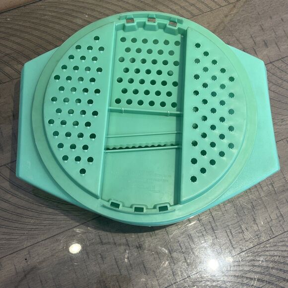 The Tupperware Vintage Jadeite Green Bowl with a Cheese Grater Slicer Lid is a set of two appliances designed for grating cheese. This set includes a bowl and a lid grater with a grate blade, perfect for slicing or grinding cheese. The jadeite green color adds a retro touch to your kitchen, while the Tupperware brand ensures quality and durability. Perfect for anyone looking to add a vintage flair to their kitchen tools while also having a convenient and practical cheese grater slicer.
