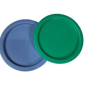 Vintage One Touch food storage bowls from Tupperware. Three (3) white 16oz bowls two (2) lids, green and blue. Dishwasher safe. Due to light & screen variations, colors may vary slightly from the images