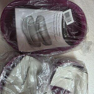 breakfast maker for microwave cooking complete with instructions and recipes. Maroon color, easy prep and wash. Great for omelets, French toast, poached eggs and fritatta. No mars or scratches like new! Tray with lid and four poaching cups included. Dimensions 9" long 5" wide.
