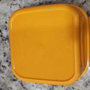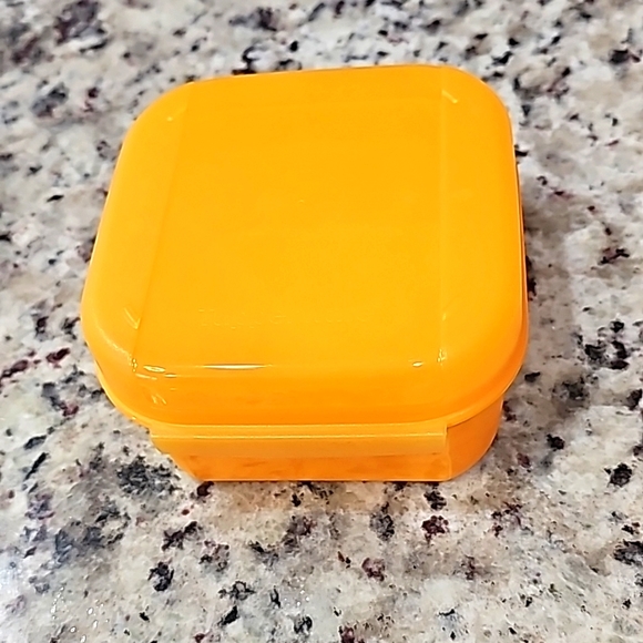 Bright orange Tupperware container. Secure snap-on lid. Durable plastic for everyday use. Compact and stackable.