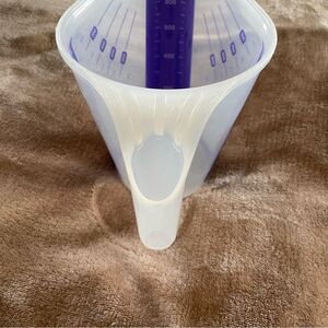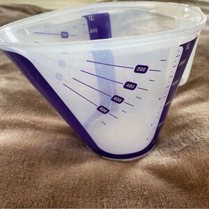Stylish measuring cup with purple markings. Ideal for kitchen use. It will show the remaining amount of liquid even when pouring. Some signs of use (please see photos). Let me know if you have any questions!