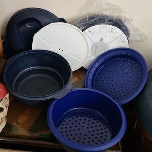 Thus is a Tupperware micro-cooker and steamer set. For use in the microwave. This set is new without package.