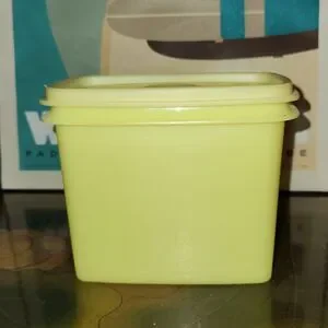 This is a Tupperware Yellow Container. It stands about 4" tall x 4.5" wide x 2.5" deep.