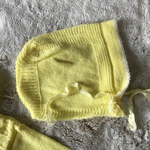 Bonnet: Knit. 5.50” x 5.75” cover. 6” ties