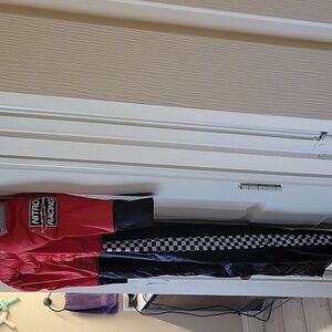 Turbo racer Halloween costume. Size little boys large (4-6). Very cute costume with built in muscles and black and white checkered detail. Please see pictures for measurements. Costume was worn briefly for about an hour. Excellent condition!