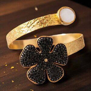 Step into timeless beauty with this breathtaking Turkish artisanal jewelry set, handcrafted in Istanbul by expert artisans. Featuring a striking hammered 18K gold-plated brass finish, dazzling hematite crystal–encrusted black floral accents, and luminous glass pearl inlays, this coordinated set is the perfect balance of elegance and bold style. The adjustable open cuff bracelet and ring ensure a comfortable fit, while the earrings add a touch of refined sophistication. Whether worn together or separately, this set makes an unforgettable statement. ✨