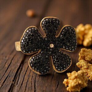 Black flower jewelry set | Turkish artisan jewelry | 18K gold plated brass jewelry | hammered texture bracelet | hematite crystal flower ring | pearl inlay stud earrings | boho chic jewelry | statement bracelet and ring | handmade Istanbul jewelry | artisanal jewelry set | timeless jewelry gift | elegant floral statement set | bold gold jewelry | chic black and gold accessories | luxurious artisan fashion jewelry | unique