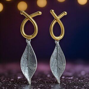 boho leaf earrings, Turkish artisan earrings, gold plated leaf jewelry, nature inspired earrings, boho chic dangle earrings, handmade jewelry Istanbul, artisan drop earrings, two-tone mixed metal earrings, fall fashion accessories, trending lightweight earrings, boho