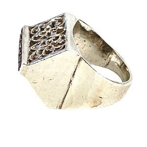 This vintage men's ring boasts a unique filigree design and is adorned with alternating ruby and emerald stones, exuding an air of timeless elegance. Its intricate craftsmanship and bold, geometric shape make it an eye-catching accessory for special occasions or daily wear.