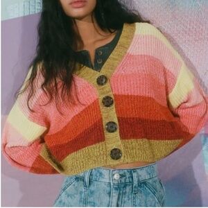Classic button-down cardigan from UO in a cozy ribbed knit. V-neck silhouette offers a relaxed fit with a slightly cropped hem and ribbed trims. Exclusively at Urban Outfitters.