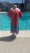 Vibrant dress with a button-down front. Features a mix of red, purple, and blue patterns.