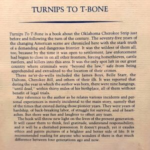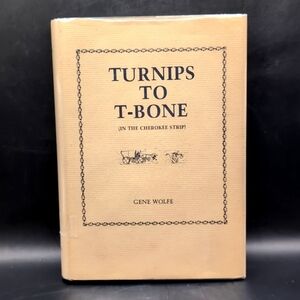 Turnips To T-Bone (In the Cherokee Strip) by Gene Wolfe. 1st Edition / First Edition. Sultana Press Fullerton 1977 hardcover. Signed, with inscription, by author (Grayce was his wife, as noted on the Acknowledgments Page). Illustrated. Original Dust Jacket protected with a Plastic-Kleer Book Cover Jacket. This rare and vintage book about the Cherokee Strip in Oklahoma is a perfect addition to any bibliophile's collection. Solid Binding. 297 Pages. No Rips, Tears or Stains. Very Good to Excellent Pre-Owned Condition.