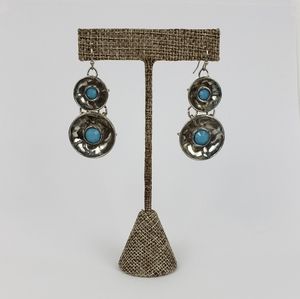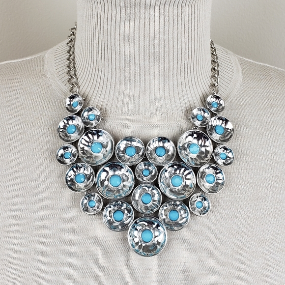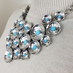 I offer this style in 2 color options! This set is plated rhodium with faux turquoise acrylic stones set in bowl like castings. In new condition never worn. Stored away in my portfolio over the years. This set was sold to Cache in the hematite colorway.