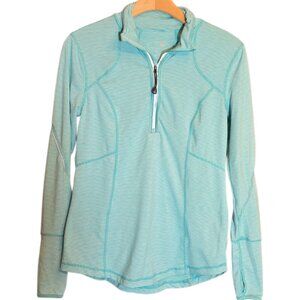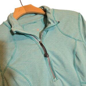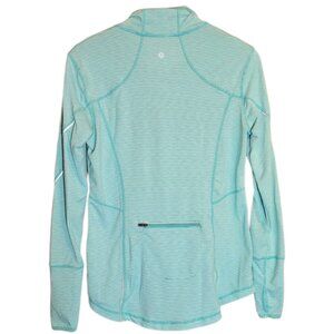 This Pullover by TANGERINE features a 1/4 zip, long sleeves, thumb holsters, and a back wasit zip pocket. Turquoise and white stripes. Size small.