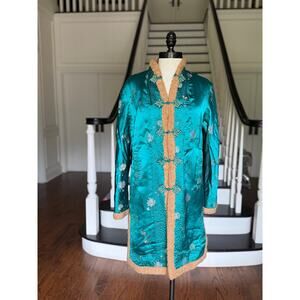 Turquoise Asian Silk Faux Fur Warm Cozy Coat Fall Winter Boho Artsy Chinoiserie