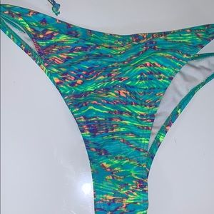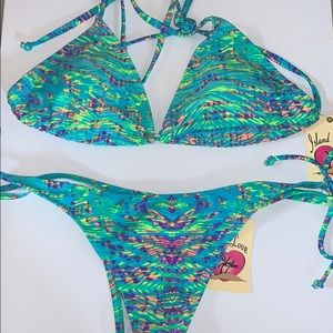 This swimsuit comes with a slide triangle bikini top and side tying bottoms it’s in the color turquoise Aztec. This swimsuit is adjustable in size because of the ties. It’s perfect for spring break or the summer!