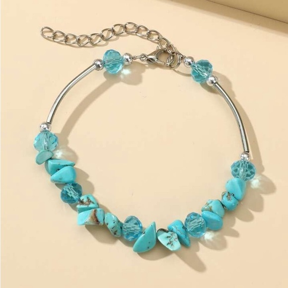 Elegant turquoise beaded bracelet featuring silver accents. Perfect for adding a pop of color to any outfit.