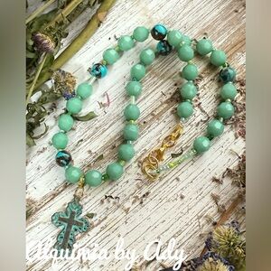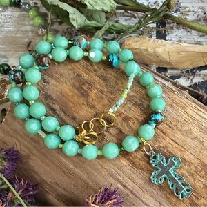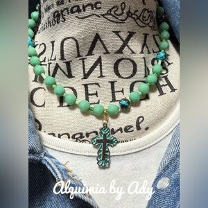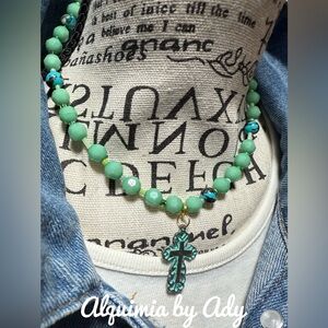 Elegant turquoise beaded necklace featuring a detailed cross pendant. Perfect for adding a touch of color to any outfit.