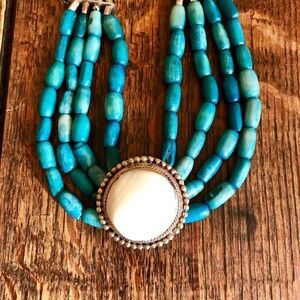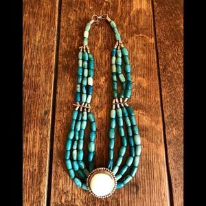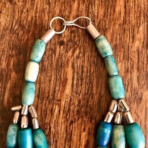 Elegant turquoise beaded necklace featuring silver accents. Perfect for adding a pop of color to any outfit.