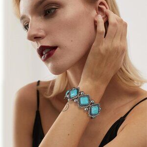 Material: Natural turquoise stones, silver-tone metal, stretch cord