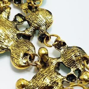 Description: This is a large chunky necklace with an antiqued gold metal backing. Large oval rhinestones, round rivoli style turquoise rhinestones, highlighted with smaller bright shiny clear rhinestones