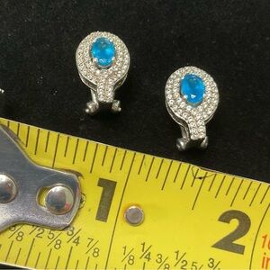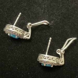 These exquisite earrings showcase a vibrant turquoise blue oval stone at their center, encircled by a halo of shimmering clear stones. Stamped “925” The Sterling Silver setting adds a touch of sophistication, making them a perfect accessory for any elegant occasion. Earrings have a lever back or latch back. Great Condition