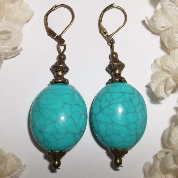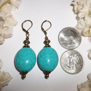 You will love this big beautiful earring set! Brand new & handmade by me - wvluckygirl. Done with oval acrylic turquoise blue beads with a brown marbling. They have antiqued rustic bronze toned costume jewelry beads. The pair dangle & drop from lever backs for women's pierced ears. 2 3/8 inches tall & 3/4 inches wide. Each single earring weighs 4.7 grams.