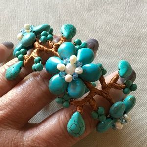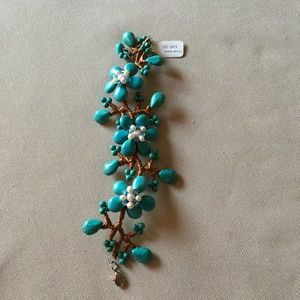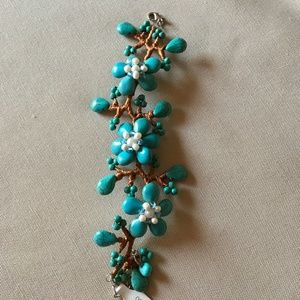 Turquoise looking bracelet. Flowers, brown branches and little pearl and blue crystals make up the center of the flower. Adjustable lobster claw closure 7” to 9.5”. Stones are not real but the bracelet is unique looking.