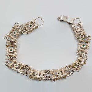 Great unique vintage sterling silver bracelet! This is done in a brutalist, modern design with textured bamboo inspired sterling! There are 9 links to this bracelet. The center of the links have tiny turquoise insets. This is nice and fluid so it flows over your wrist. Great on it's own or layer it with more for a bohemian statement.