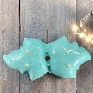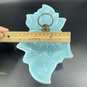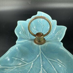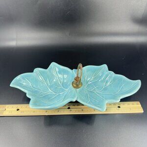 Turquoise Ceramic Dish with White Swirls Double Leaf Tidbit Tray Dish Metal VTG