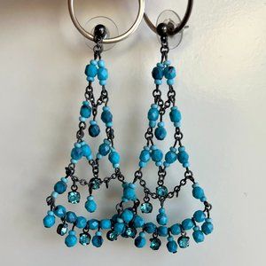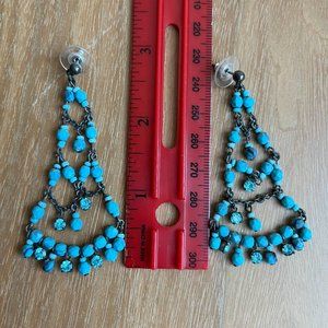 Turquoise-colored beads with sparkly aqua stones. Post closure. Approximately 3 inches long. One stone missing from each earring, but they're in the same spot so they match and it's hard to tell something is missing.