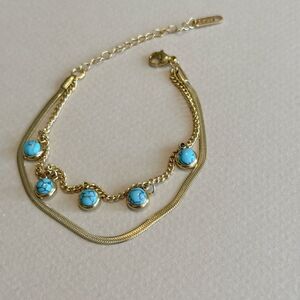 Elegant gold bracelet featuring vibrant turquoise charms. Perfect for adding a pop of color to any outfit.